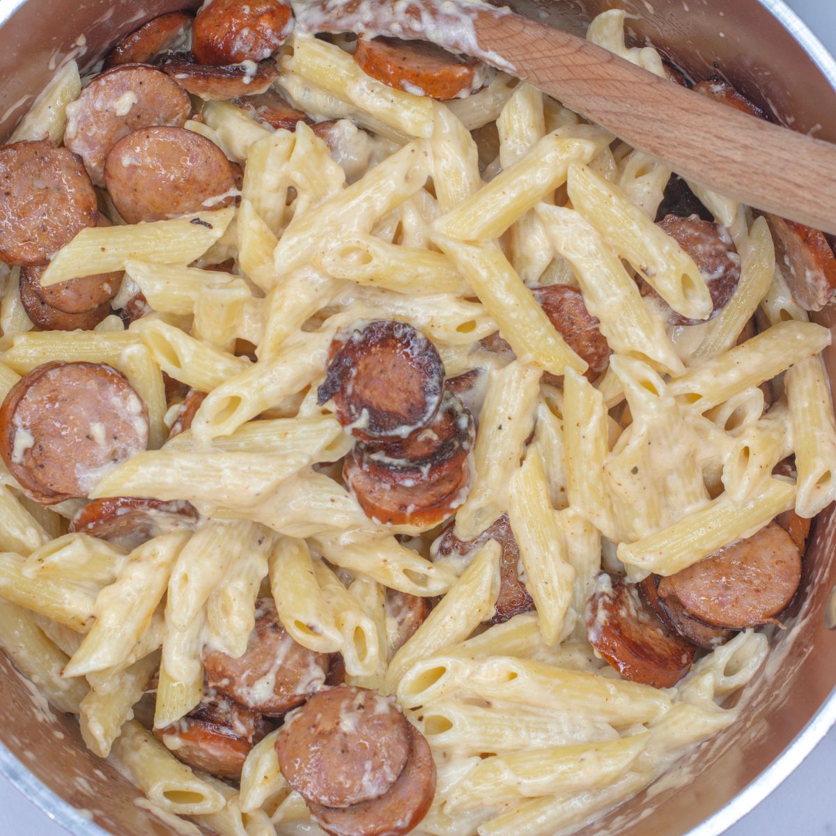 - Drain the pasta and add it to the sauce. Add the cooked sausage back in the pasta and sauce. Stir together and serve while hot. Enjoy!