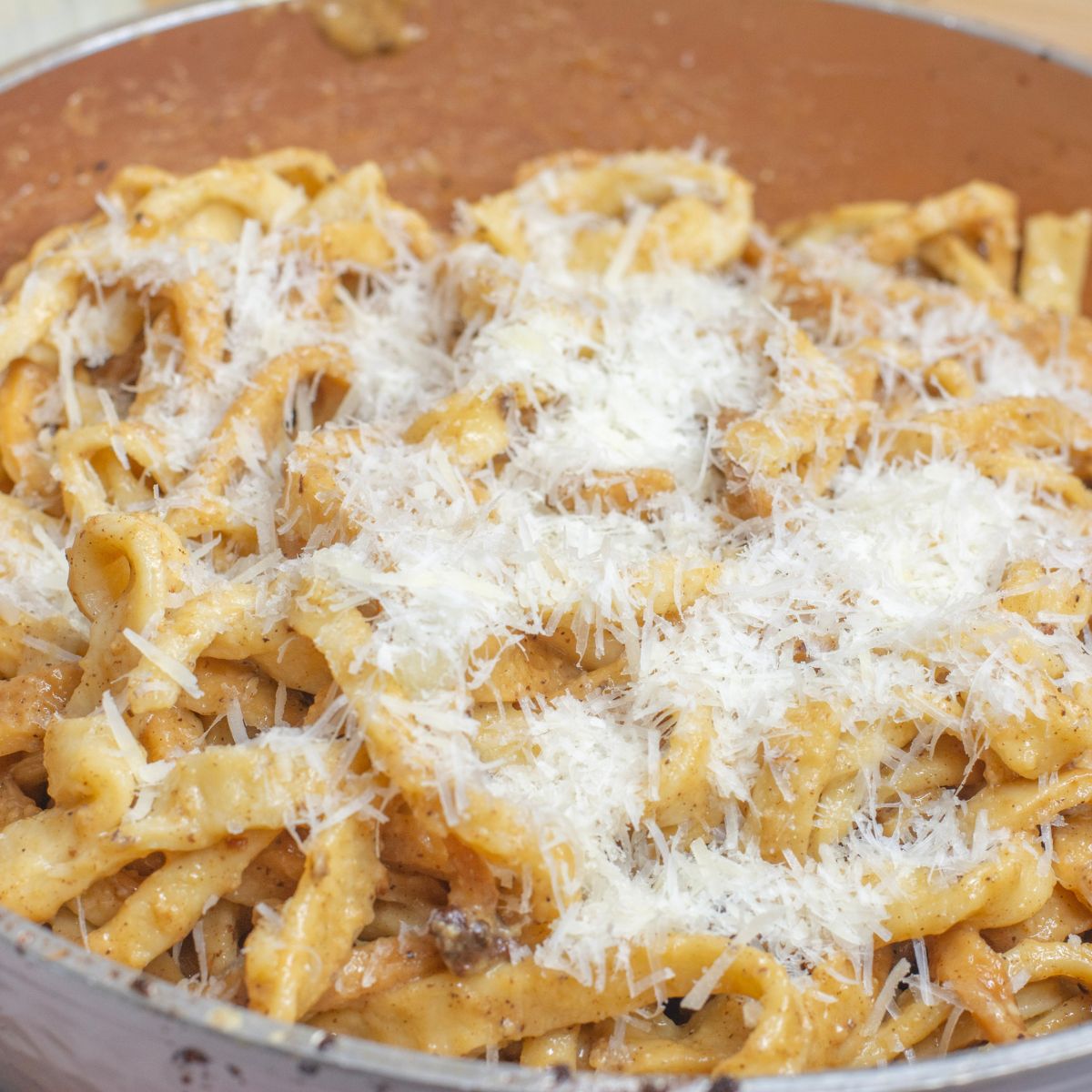 - Immediately after draining the pasta, Toss it into the skillet with the bacon grease while the pan is still warm. Remove the skillet from the heat, then quickly add the egg and cheese mixture to the pasta, stirring vigorously to create a creamy sauce. The residual heat from the pasta will cook the eggs just enough without scrambling them.
